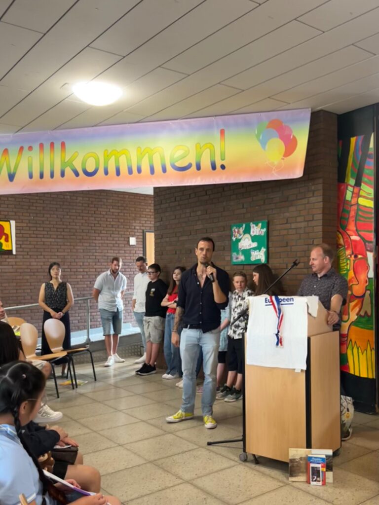 Musikalisch begrüßt wurde die „Neuen“ von den Schülerinnen und Schülern des 6. Jahrgangs, die unter der Leitung der Musiklehrkraft Jihye Han-Riedesel eigens für diesen Tag einen großen Chor gebildet haben. „Ich bin gut so, wie ich bin“, dieser Titel sollte den neuen Schülern Mut machen, sich ohne Vorbehalte auf die neue Schule einzulassen und eigene Ziele zu verfolgen. Und auch die Paten aus dem