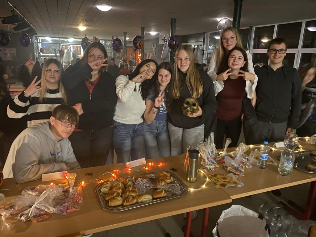 Organisiert wurde die diesjährige Halloween-Feier, die gemeinsam mit der Hauptschule Munster ausgerichtet wurde, von Jessica Adler, die für ein buntes Programm sorgte. Unterstützt wurde sie auch von Schülerinnen und Schülern der 9a, die für das leibliche Wohl sorgten, sowie von einigen Kolleginnen und Kollegen beider Schulformen. Und auch die Firmen „Snowworld“ und Famila haben die Feier gesponsort, in dem sie kostenlos Preise und Gewinne zur Verfügung stellten.