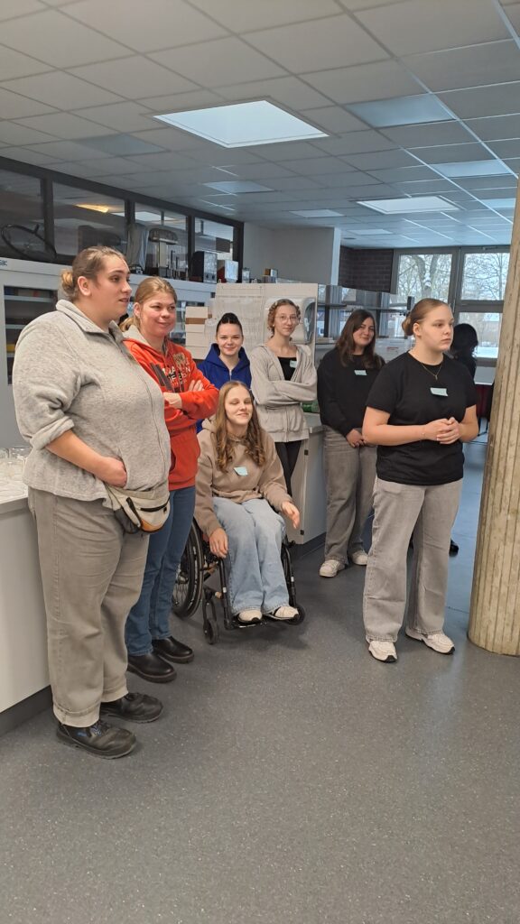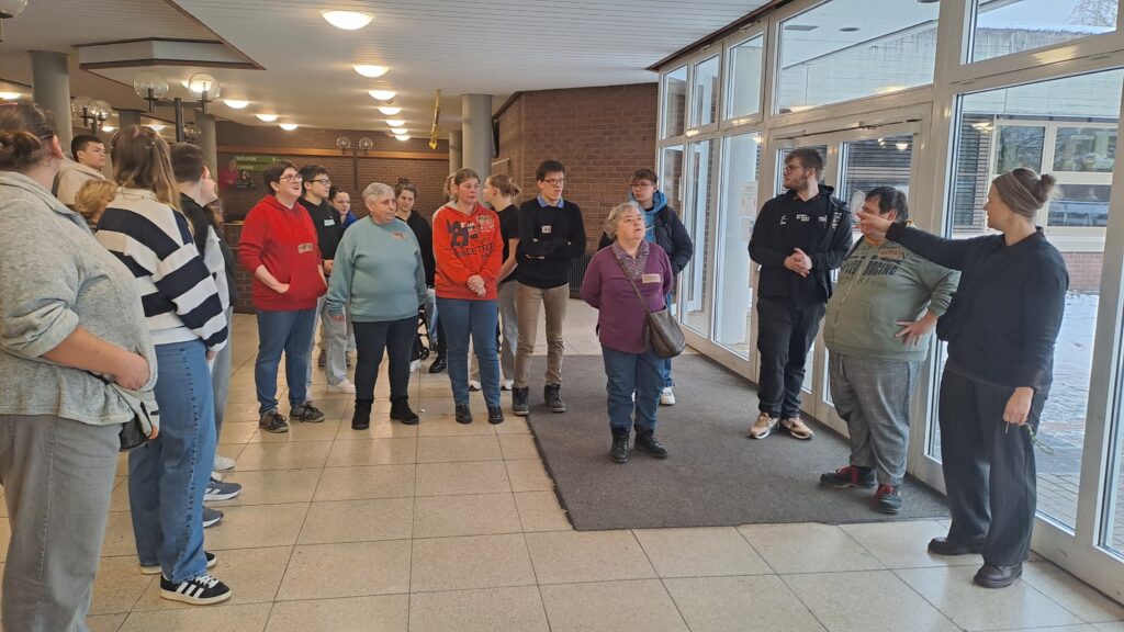 „Sonst kommen die Schüler zu uns, jetzt ist es mal andersrum“, sagt Lars und freut sich, Gast an der Realschule Munster zu sein. Denn es ist leider immer noch nicht alltäglich, dass Menschen mit und ohne Behinderungen Zeit miteinander verbringen. Gemeinsam mit 13 weiteren Beschäftigten und Mitarbeitenden des Heidewerks konnte er sich einen Einblick über den Schulalltag verschaffen. Auch Sabine fühlt sich auf Anhieb in der ihr eigentlich fremden Umgebung pudelwohl, „mir gefallen die Schülerinnen und Schüler, sie sind alle sehr nett und gesprächig.“